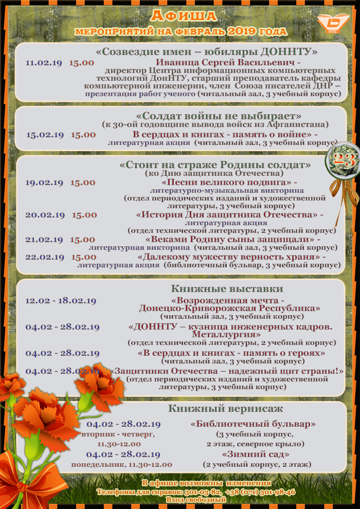 Научно-техническая библиотека ДонНТУ предлагает вашему вниманию афишу мероприятий на февраль к знаменательным историческим и культурным событиям.
