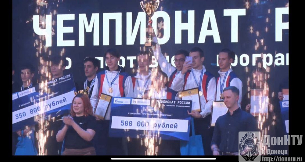 Команда «E-notGPT», уже не раз проявившая себя в этой сфере, одержала победу в дисциплине «продуктовое программирование». В её состав вошли студенты кафедры программной инженерии им. Л. П. Фельдмана Михаил Вавилин, Константин Руднев, Даниил Киселёв и студенты кафедры автоматизированных систем управления Леонид Сыгинь и Иван Сыгинь. Тренер команды – кандидат технических наук, доцент кафедры АСУ Елена Осиповна Савкова. Своего ошеломляющего успеха команда достигла при содействии Спортивного клуба ДонНТУ, став первым чемпионом России по спортивному программированию.
