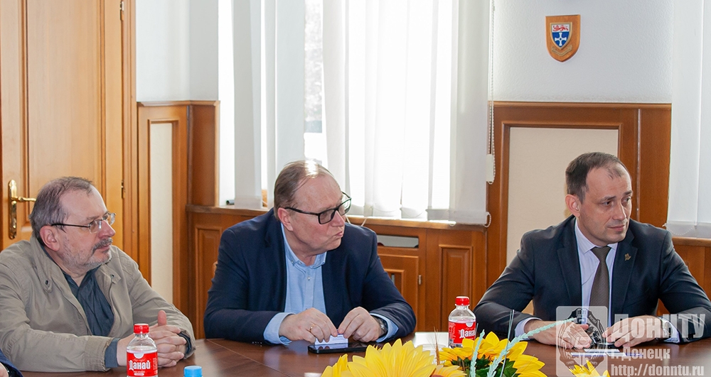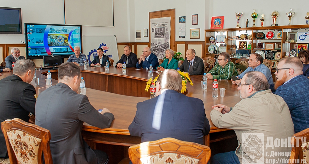 После экскурсий по лабораториям встреча продолжилась в зале заседаний 1 учебного корпуса. Ректор познакомил гостей с историей создания ДонНТУ – одного из первых вузов в СССР, награждённого за выдающиеся заслуги орденом Трудового Красного Знамени. Александр Яковлевич рассказал о техническом развитии Донбасса, в котором огромную роль сыграли Артём (Ф. А. Сергеев) – основатель и руководитель Донецко-Криворожской Советской Республики (1918), он вёл большую работу по восстановлению угольных шахт бассейна, а также студент рабфака Донецкого горного техникума Никита Сергеевич Хрущёв – первый секретарь ЦК КПСС (1953–1964) и Председатель правительства СССР (1958–1964).