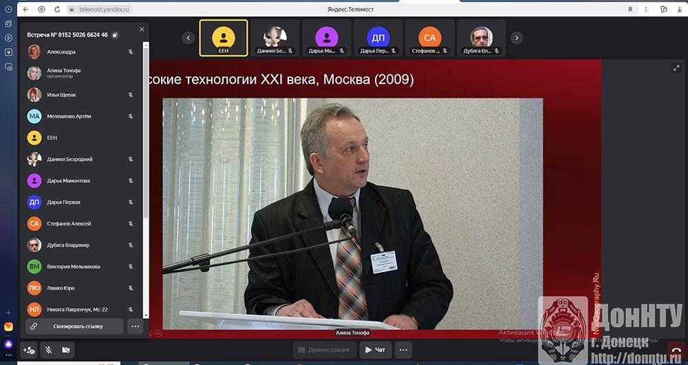 В Молодёжном клубе Русского географического общества «Донбасс» на базе Донецкого национального технического университета 18 апреля прошла онлайн-лекция на тему: «Неогеография – география после карт», организованная руководителем клуба Алиной Витальевной Тонофа, при поддержке ректора ДонНТУ Александра Яковлевича Аноприенко. Лектором выступил руководитель группы «Неогеография»», научный сотрудник географического факультета МГУ им. М. В. Ломоносова Евгений Николаевич Ерёмченко.