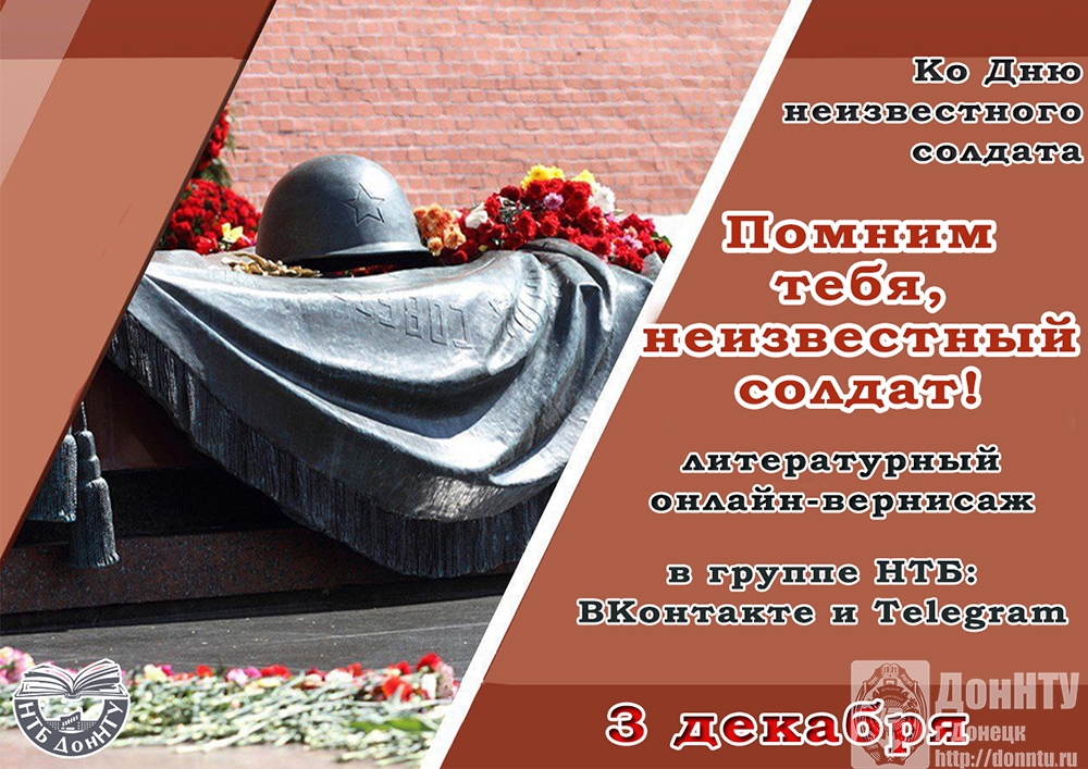 – ко Дню неизвестного солдата принять участие в литературном онлайн-вернисаже «Помним тебя, неизвестный солдат!» (в группах НТБ и , 3 декабря);