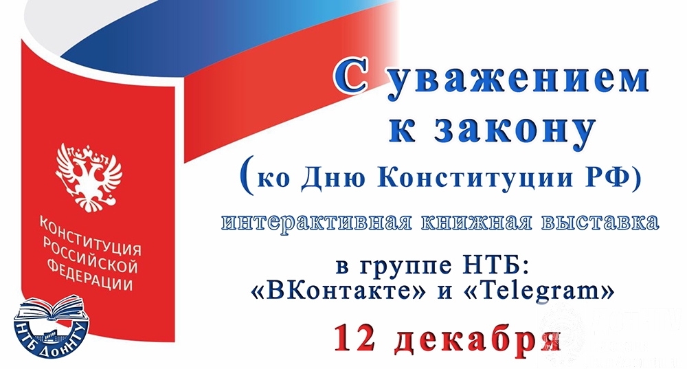 – ко Дню Конституции РФ ознакомиться с интерактивной книжной выставкой «С уважением к закону» (в группах НТБ «ВКонтакте» и «Телеграм», 12 декабря).