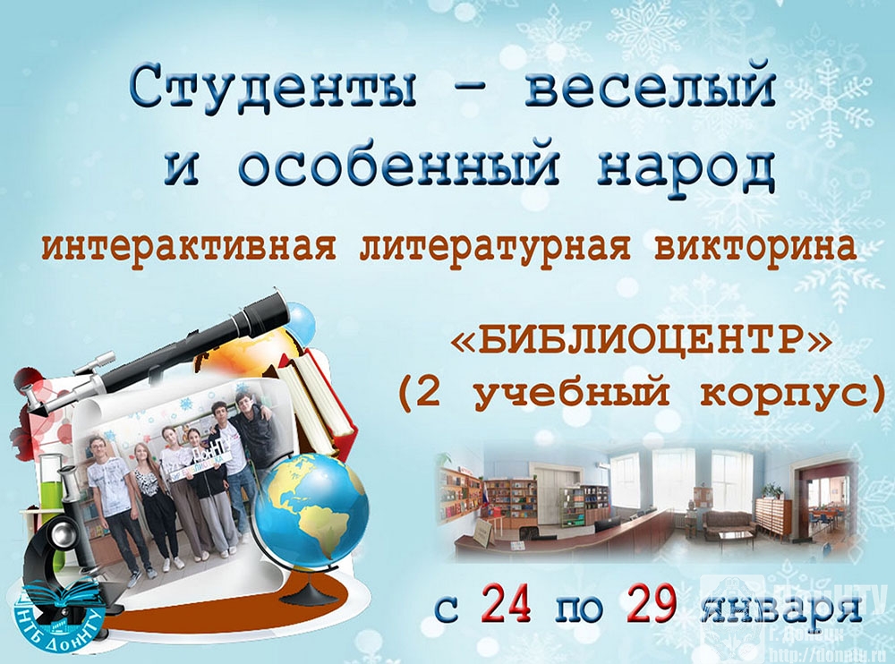 – ко Дню российского студенчества принять участие в литературных викторинах «Студенты – веселый и особенный народ» («БИБЛИОЦЕНТР», 2 учебный корпус) и «От сессии до сессии…» (читальный зал «Перекресток на Садовом», 9 учебный корпус) – с 24 по 29 января;