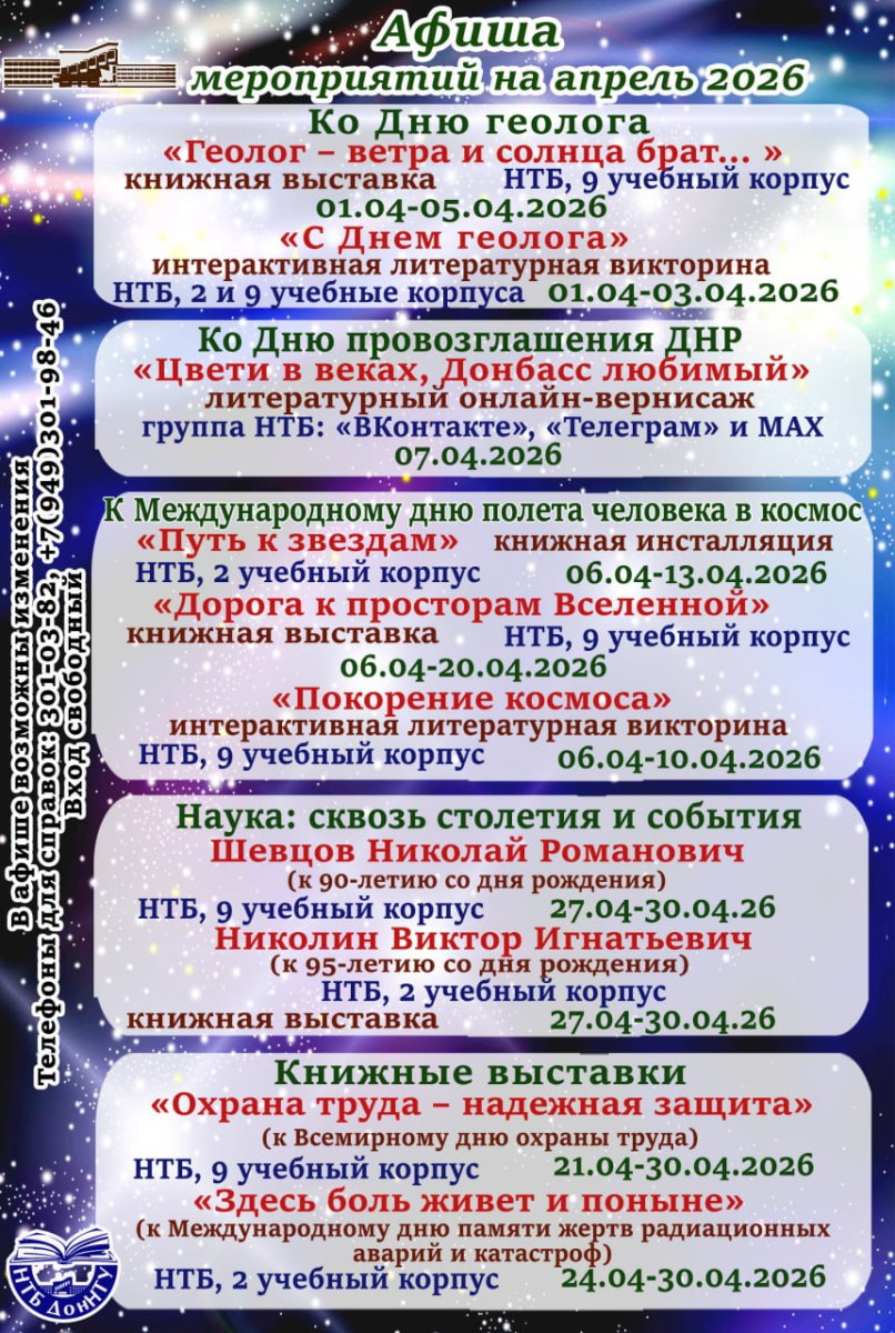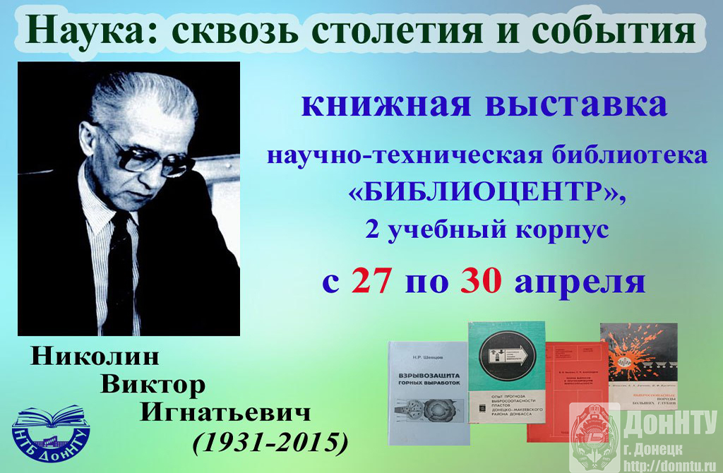 Также научно-техническая библиотека приглашает ознакомиться с книжными выставками «Наука: сквозь столетия и события», посвящёнными 90-летию со дня рождения заведующего кафедрой строительства шахт и подземных сооружений доктора технических наук, профессора Николая Романовича Шевцова (1936–2021) (читальный зал «Перекресток на Садовом», 9 учебный корпус, с 27 по 30 апреля) и 95-летию со дня рождения заведующего кафедрой охраны труда и аэрологии имени И. М. Пугача доктора технических наук, профессора Виктора Игнатьевича Николина (1931–2015) («БИБЛИОЦЕНТР», 2 учебный корпус, с 27 по 30 апреля), принять участие в интерактивной книжной выставке «О сколько нам открытий чудных…», посвящённой Десятилетию науки и технологий, и литературном онлайн-вернисаже «Сила России – в единстве народов!», посвящённом Году единства народов, посетить постоянно действующие книжные выставки «История ДонНТУ в книгах» и «Ученые мира – юбиляры 2026» в течение года.