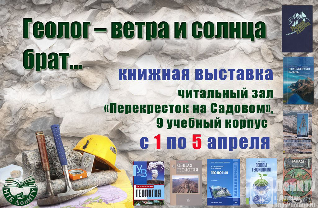 – ко Дню геолога ознакомиться с книжной выставкой «Геолог – ветра и солнца брат!..» (читальный зал «Перекресток на Садовом», 9 учебный корпус, с 1 по 5 апреля);