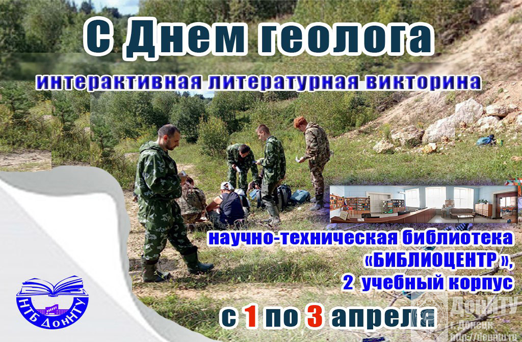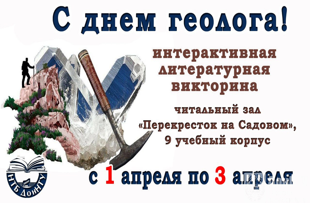 - принять участие в интерактивных литературных викторинах «С Днем геолога» («БИБЛИОЦЕНТР», 2 учебный корпус и читальный зал «Перекресток на Садовом», 9 учебный корпус, с 1 по 3 апреля);