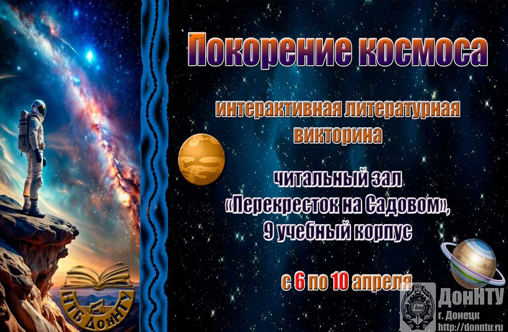 - принять участие в интерактивной литературной викторине «Покорение космоса» (читальный зал «Перекресток на Садовом», 9 учебный корпус, с 6 по 10 апреля);